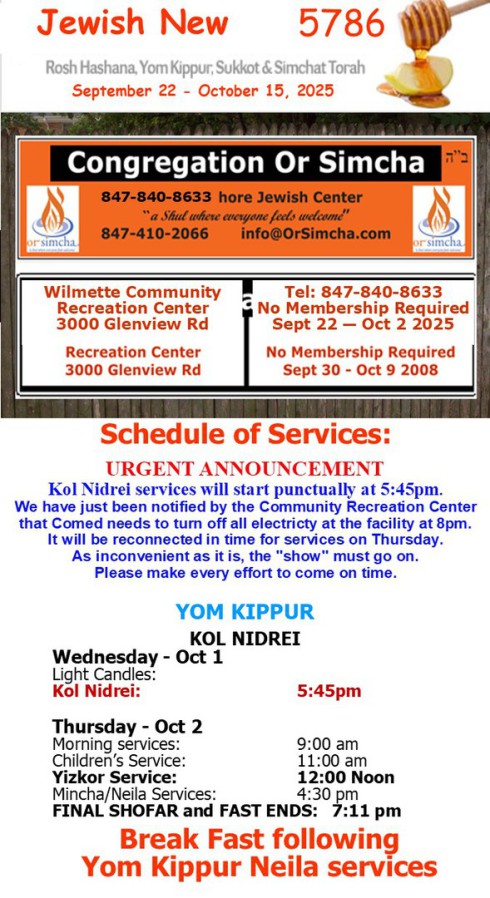 or mail check to our mailing address: CONG. OR SIMCHA 237 Thelin Ct, Wilmette IL 60091